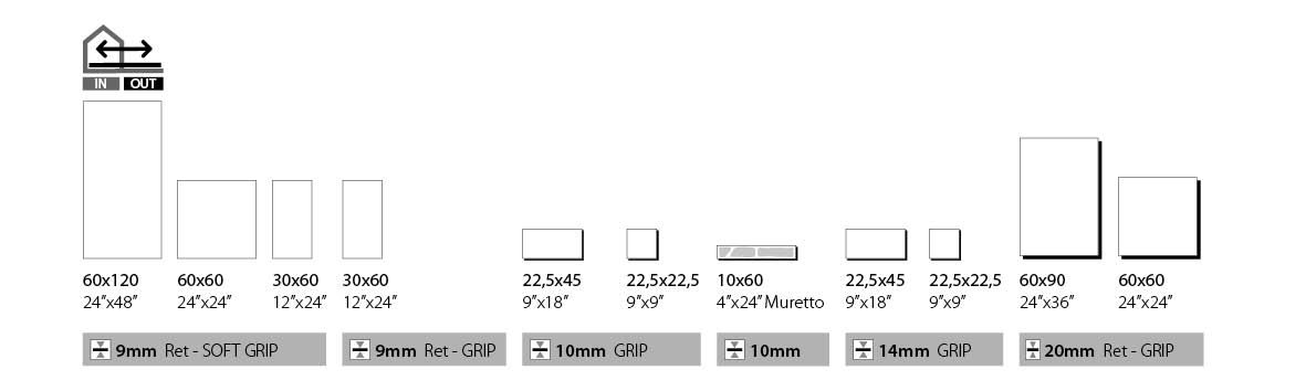 La scelta degli spessori tra 9mm, 10mm, 14mm e 20mm permette di rispondere non solo alle esigenze estetiche ma anche tecniche del luogo. Lo spessore 14mm e il muretto in 10×60 1 cm di spessore (una decorazione che emula perfettamente l’effetto pietra naturale grazie all’incredibile effetto ottico e tattile) caratterizzano la gamma.
